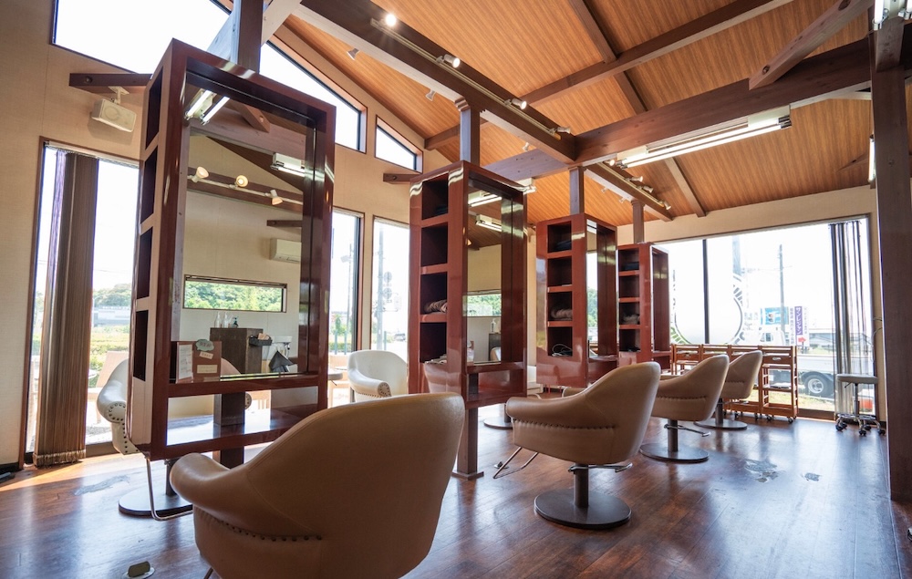静岡県浜松市中央区にある「ALLURE」は、温もりある木のインテリアと高い天井が、心地よい開放感を演出しているサロンです。