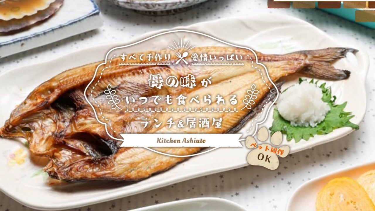 岡山県倉敷市にあるランチ&居酒屋「Kitchen Ashiato」は、ペットと一緒に入れるカジュアルレストランです。